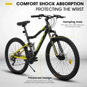 Wir präsentieren unser neues 26-Zoll-Fully-Mountainbike mit einem stabilen und komfortablen Carbonstahlrahmen für Offroad-Abenteuer. Ausgestattet mit einem Daumenschalthebel und einer 21-Gang-Schaltung ermöglicht dieses 26-Zoll-Bike nahtlose Gangwechsel für unterschiedlichstes Terrain. Das Mountainbike für Erwachsene verfügt über reaktionsschnelle Scheibenbremsen, die in jeder Situation zuverlässige Bremskraft gewährleisten. Die Vollfederung absorbiert effektiv Vibrationen und sorgt so für ein geschmeidigeres Fahrgefühl. Unser Fully-Mountainbike ist einsteigerfreundlich und gleichzeitig robust. Dieses Mountainbike für Damen und Herren vereint alle wichtigen Funktionen für Einsteiger, die die Natur mit Selbstvertrauen und Kontrolle erkunden möchten.