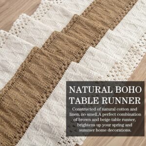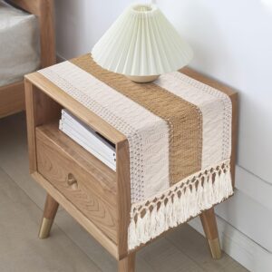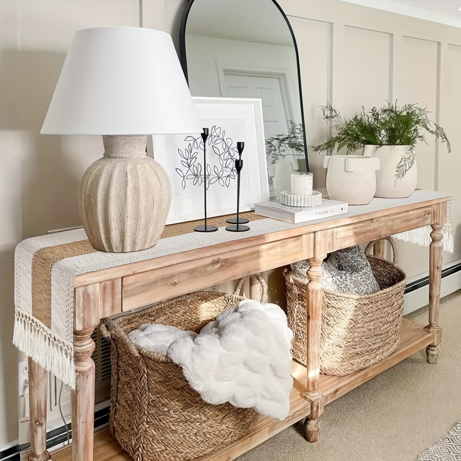 Bring quiet, natural texture to your dining table with this woven boho table runner in neutral beige and cream. A central, natural-toned stripe adds depth, while the macramé-style tassel fringe gives a refined, hand-finished look that suits Dutch/Scandi and modern farmhouse interiors. Layer it over wood for a warm, rustic feel or pair with stoneware and linen for a clean, contemporary setting. Practical as well as beautiful, the runner protects your tabletop from everyday wear while instantly styling breakfasts, family dinners and seasonal gatherings.