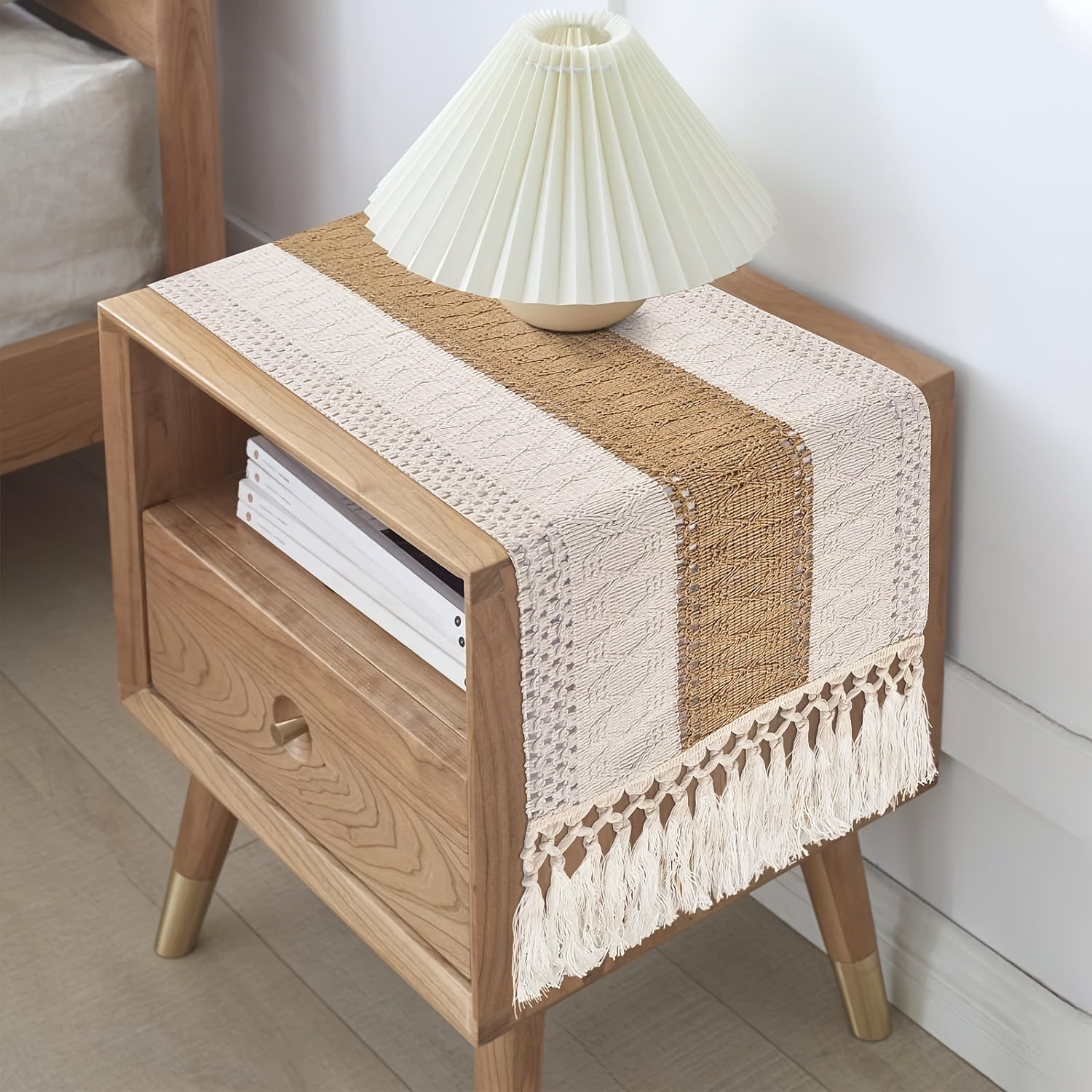 Woven runner with central natural stripe and macramé-style tassel fringe