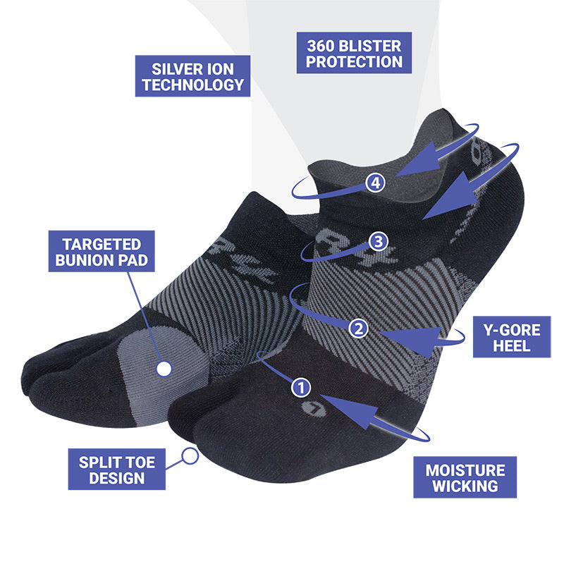 Ease bunion pain while keeping your feet comfortable with the OS1st BR4 Bunion Relief Sock. Featuring a patented split-toe design, this sock separates the big toe and cushions the bunion, combining the effects of toe spacers and bunion pads in one. Four zones of medical-grade compression stabilize the foot, while moisture-wicking, breathable yarns and Silver Ion technology keep feet dry, cool, and odor-free. Seamless, anatomically correct construction ensures a custom-like fit for all-day comfort.