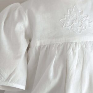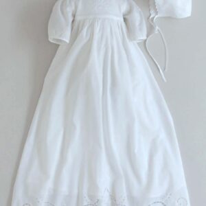 Weißes Taufkleid von Oli Prik mit langen Ärmeln und Futter. Schöne Handstickerei auf Brust und Rock.