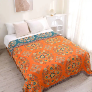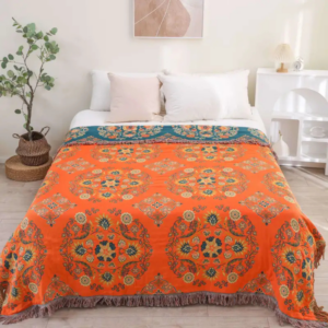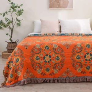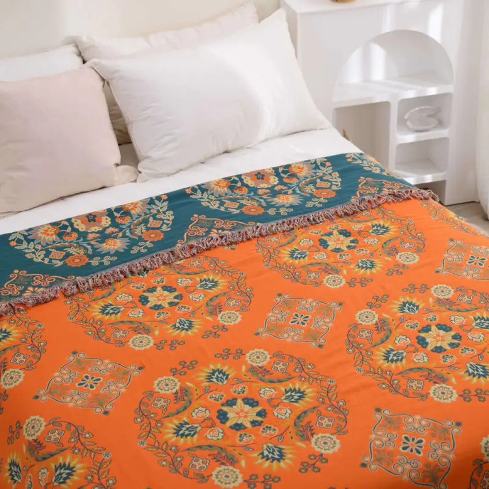 Add charm and versatility to your living space with this reversible throw blanket featuring a vintage floral motif in rich orange and teal hues. Crafted from 100% cotton with a jacquard weave, this blanket offers both style and comfort. The double-sided design lets you easily refresh your interior look, while the anti-pilling fabric ensures long-term durability. Ideal for use on sofas, beds, or as a picnic or travel blanket.
