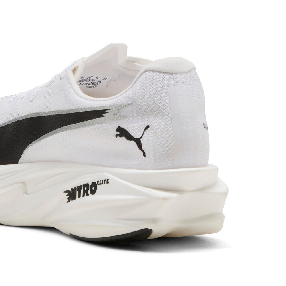 The Men’s Deviate NITRO ELITE 4 PUMAxHYROX by PUMA is a high-performance racing shoe built for speed, efficiency, and race-day execution. It delivers a finely tuned balance of lightweight cushioning and explosive responsiveness, making it ideal for competitive runners targeting fast paces and long-distance efforts. The neutral platform supports a natural stride, while the advanced midsole foam provides an energetic underfoot feel with smooth, controlled compression for sustained performance. A lightweight, breathable upper creates a secure heel fit with an accommodating forefoot, and the heel-to-toe drop promotes efficient transitions—solidifying its role as a race-day centerpiece in a performance-focused rotation.