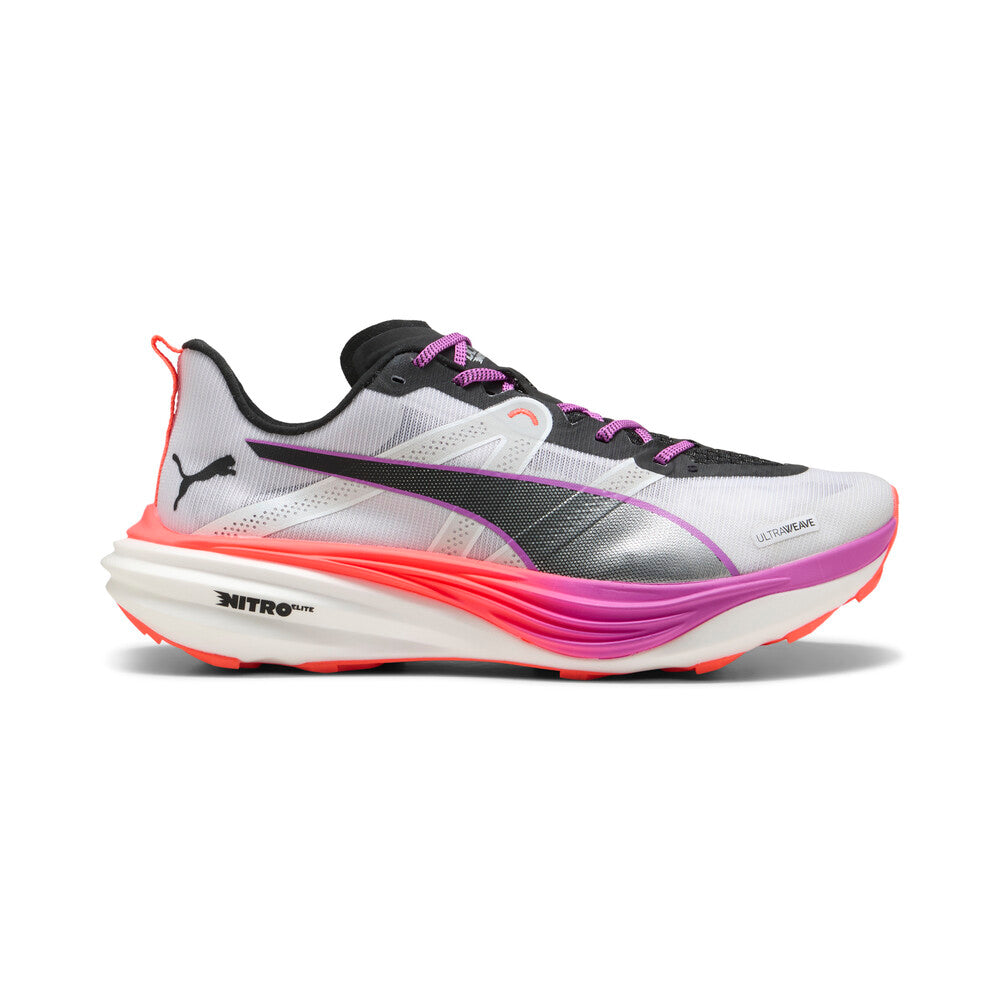 The Puma Deviate Nitro Elite Trail is a high-performance trail racing shoe. It features NitroFoam Elite cushioning, a carbon-composite plate for energy return, and PumaGrip ATR rubber for traction. Its durable UltraWeave upper ensures secure, breathable comfort on any terrain.