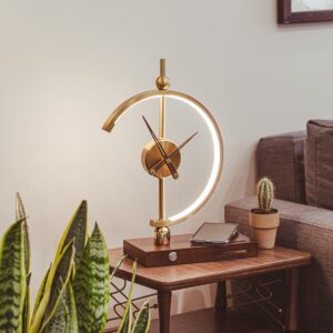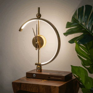 Add a bold, sculptural statement to your interior with this modern LED desk clock. Fusing the elegance of golden accents with a geometric LED arc, this clock functions as both a timepiece and a decorative ambient light. Its unique half-moon frame glows with a warm LED halo, making it ideal for bedrooms, offices, or stylish living rooms. Whether placed on a nightstand, shelf, or console table, this artistic clock is a conversation piece that brings both functionality and a luxurious aesthetic. Designed to meet the high standards of Dutch taste, this design-forward clock suits contemporary, minimalist, or eclectic spaces.