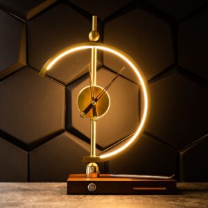 Add a bold, sculptural statement to your interior with this modern LED desk clock. Fusing the elegance of golden accents with a geometric LED arc, this clock functions as both a timepiece and a decorative ambient light. Its unique half-moon frame glows with a warm LED halo, making it ideal for bedrooms, offices, or stylish living rooms. Whether placed on a nightstand, shelf, or console table, this artistic clock is a conversation piece that brings both functionality and a luxurious aesthetic. Designed to meet the high standards of Dutch taste, this design-forward clock suits contemporary, minimalist, or eclectic spaces.